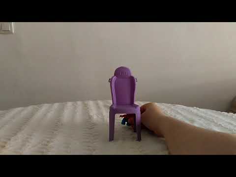 Le chat est à côté de la boîte, Romane est sur la chaise et à coté de la chaise. Comme le petit bonhomme de la vidéo ne tient pas debout, elle s'allonge.